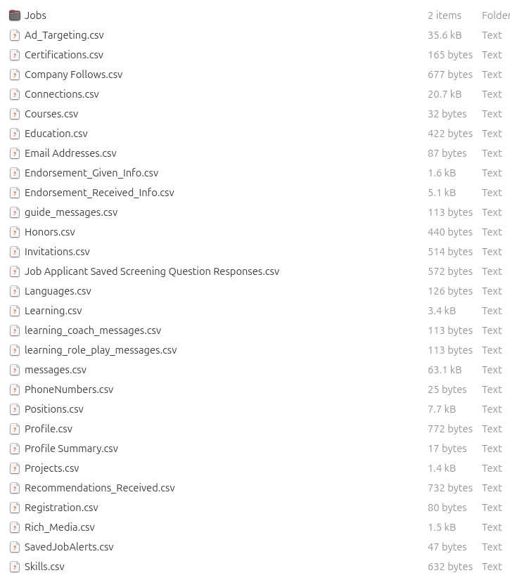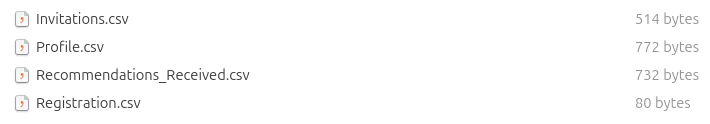 These are the columns in Profile.csv and you’ll notice none of them are “job title”, “company”, “start date”, “end date”, etc. It had my name, my location, and the blurb at the top of the profile.