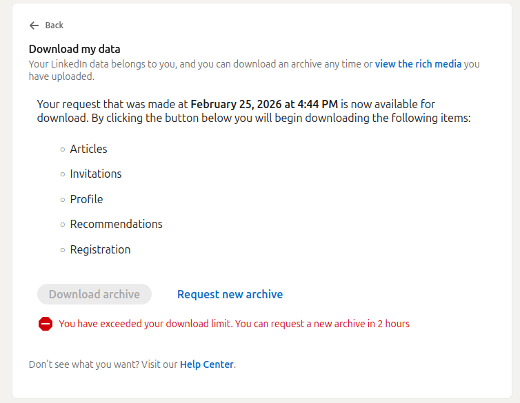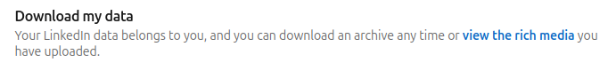 Today I went to checkout my Linked In profile using “Download my data”, and was given two options: