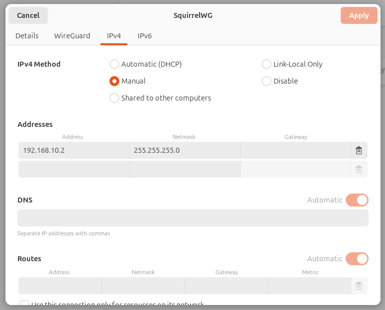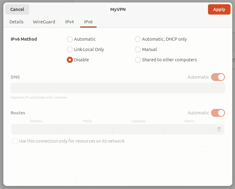 - If you change the MTU or fwmark back to 0, GNOME Settings just crashes.