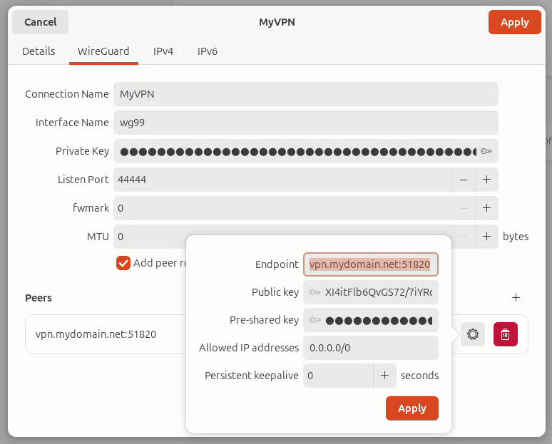 - Endpoint address: manually type it with port (ex. yourdomain.tld:port).